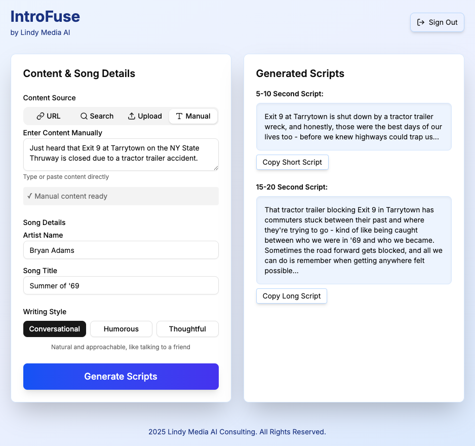 It takes whatever you're talking about: a news story, a local moment, a station promotion, a dumb meme, whatever … and welds it to the next song with emotional precision. It makes every song intro intentional, cinematic, and goosebump-ready.