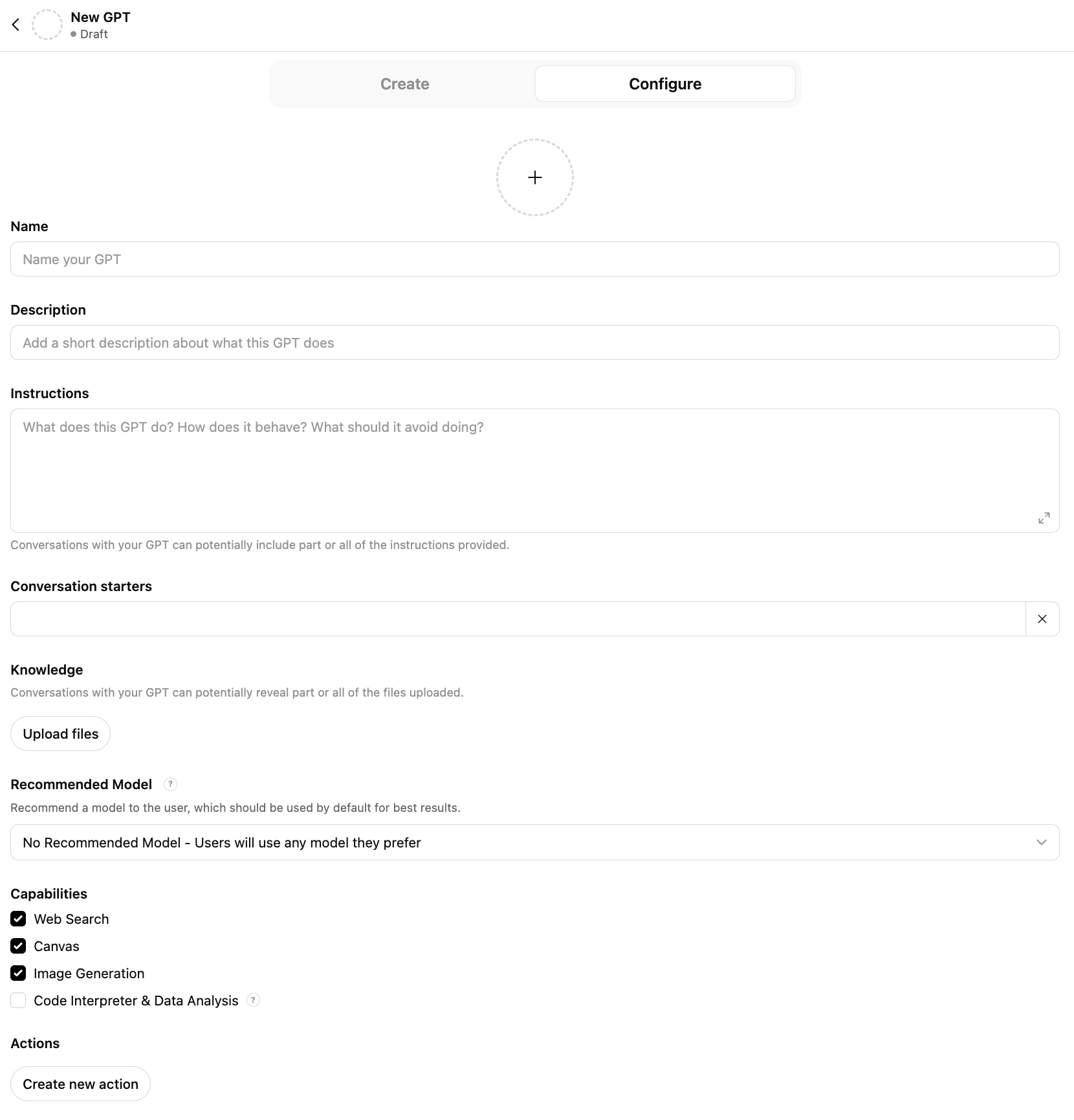 This suggests a default model for best results. If you leave it as No Recommended Model, users can still pick whatever they want. If you want more control over the output's consistency and know which model will work best for this Custom GPT’s goals, choosing one can reduce the “it worked yesterday but not today” effect.
